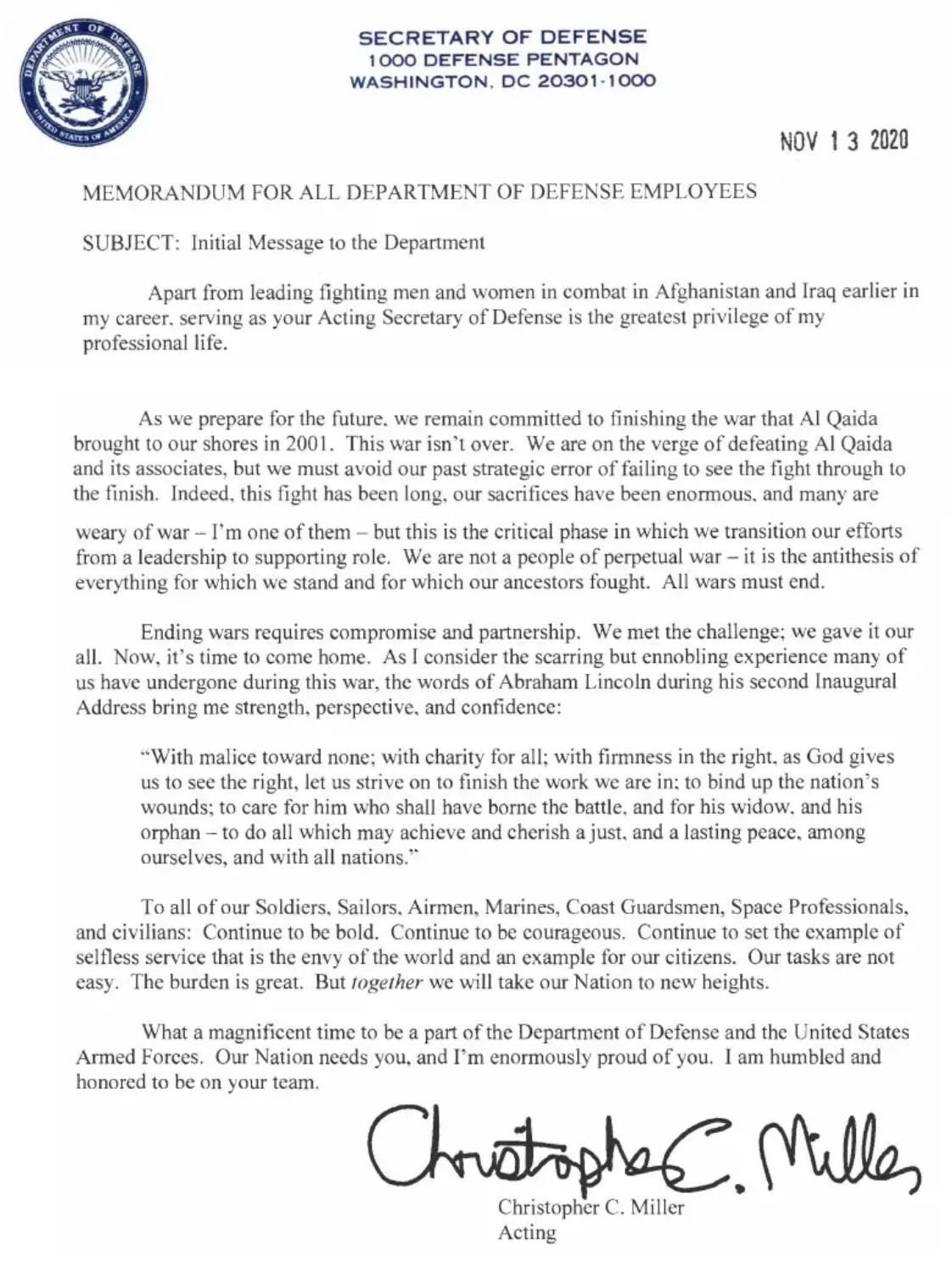 Trump’s acting defense secretary Chris Miller released a memo about Iraq and Afghanistan which states that “all wars must end” and that “now it’s time to come home”.