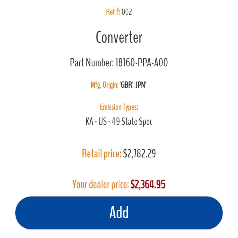 $2,364.95 for a new catalytic converter at Honda eStore, not including labor. It’s almost as if these things are made out of platinum.