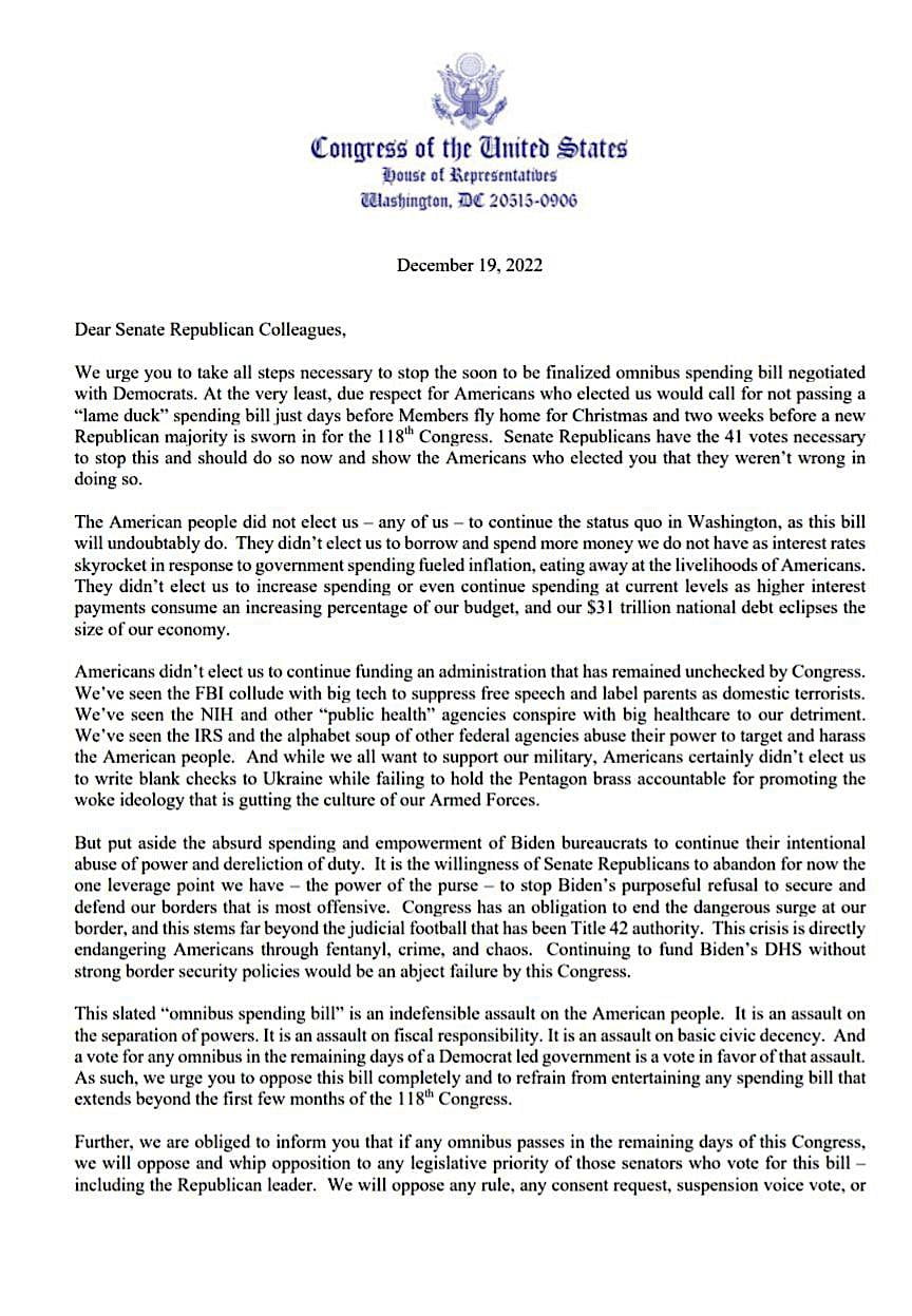 House Republicans threaten Senate Republicans with consequences to their legislative priorities, however small, if they allow the Democrat Omnibus spending bill to pass in the current legislative session.