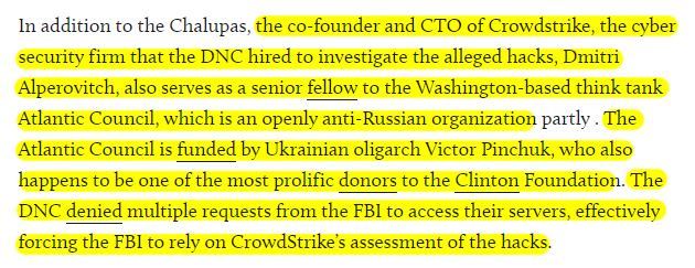 A reminder that the FBI never investigated the DNC server. The Intelligence Community’s assessment is entirely based on findings by anti-Russian / pro-Clinton security firm, Crowdstrike.