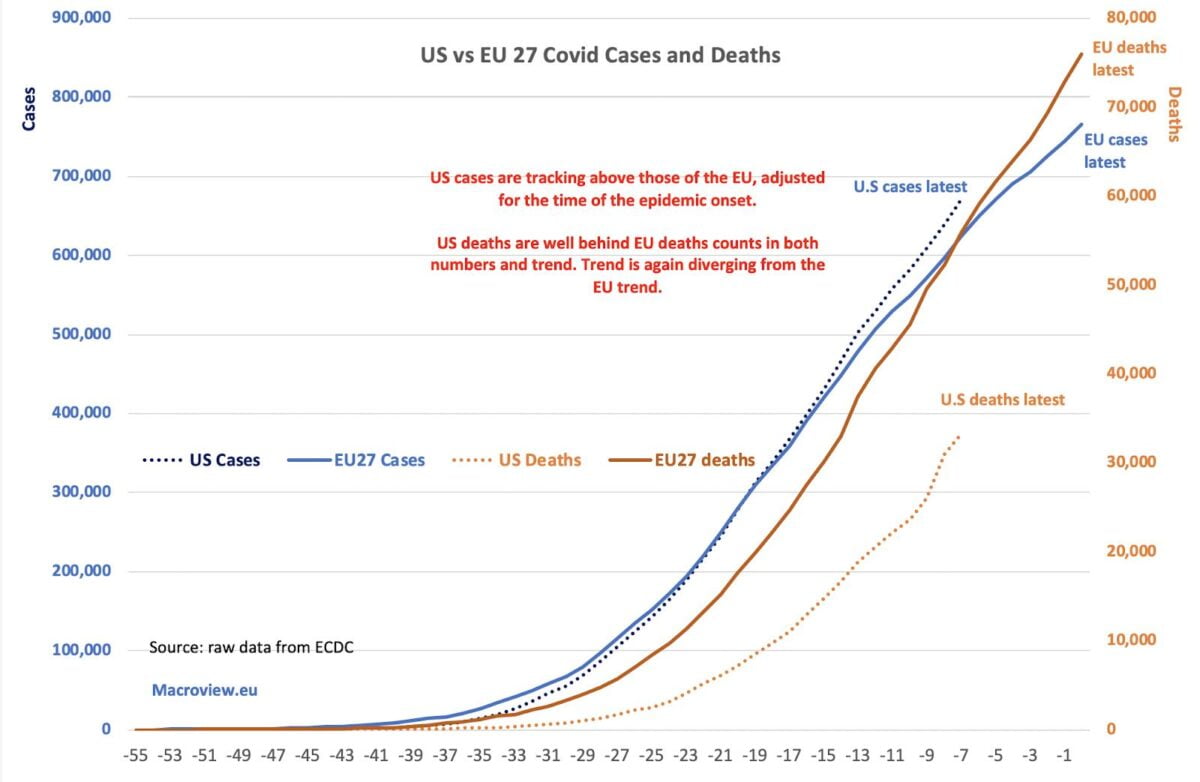 US population is approximately 329 million people. EU population is approximately 445 million people. At the same point time, US had slightly more cases than EU, yet had much fewer deaths.