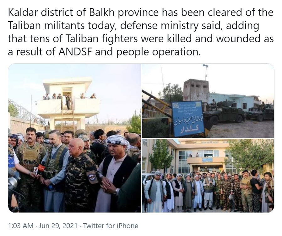 The Afghan government defense ministry put out a press release stating they’ve stopped a Taliban advance in Kaldar, Balkh. The problem is Kaldar was neither Taliban controlled, nor contested, it was one of the few government controlled districts.