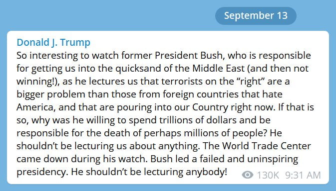 Categories via Facebook Trump statement on Bush Jr Post author By W. Post date September 13, 2021 No Comments on Trump statement on Bush Jr Trump statement on Bush Jr. ^ ← 5.2% inflation is only unreasonable if you use gas… → I used to do over a million impressions over… Leave a Reply Cancel replyYour email address will not be published. Required fields are marked *Comment * Name * Email * Website Save my name, email, and website in this browser for the next time I comment. Δ