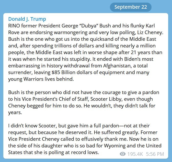 Categories via Facebook Trump statement on Bush/Cheney Post author By W. Post date September 23, 2021 No Comments on Trump statement on Bush/Cheney Trump statement on Bush/Cheney. ^ ← Save America from the Bush/Cheney families → Too many I mention this to say they didn’t… Leave a Reply Cancel replyYour email address will not be published. Required fields are marked *Comment * Name * Email * Website Save my name, email, and website in this browser for the next time I comment. Δ
