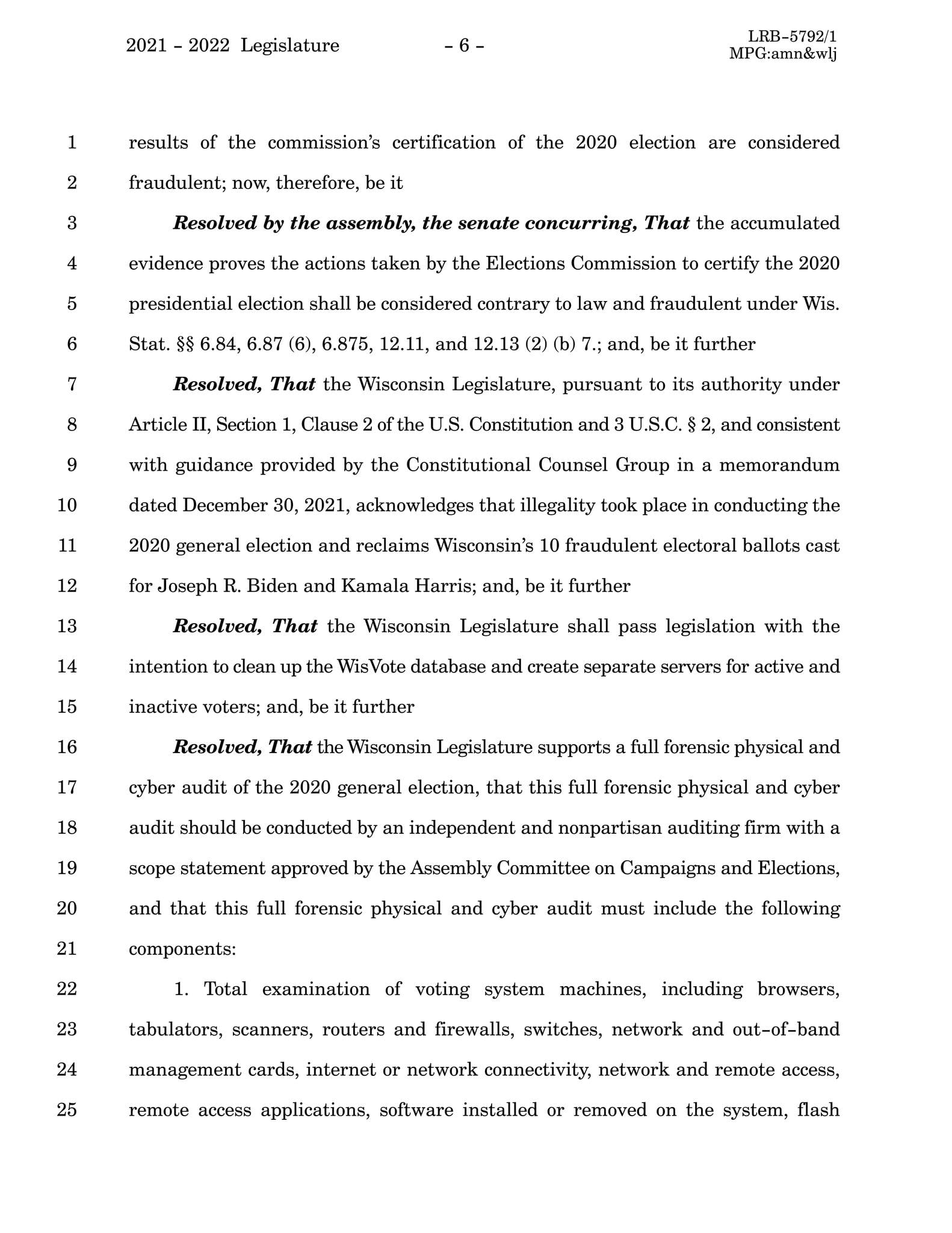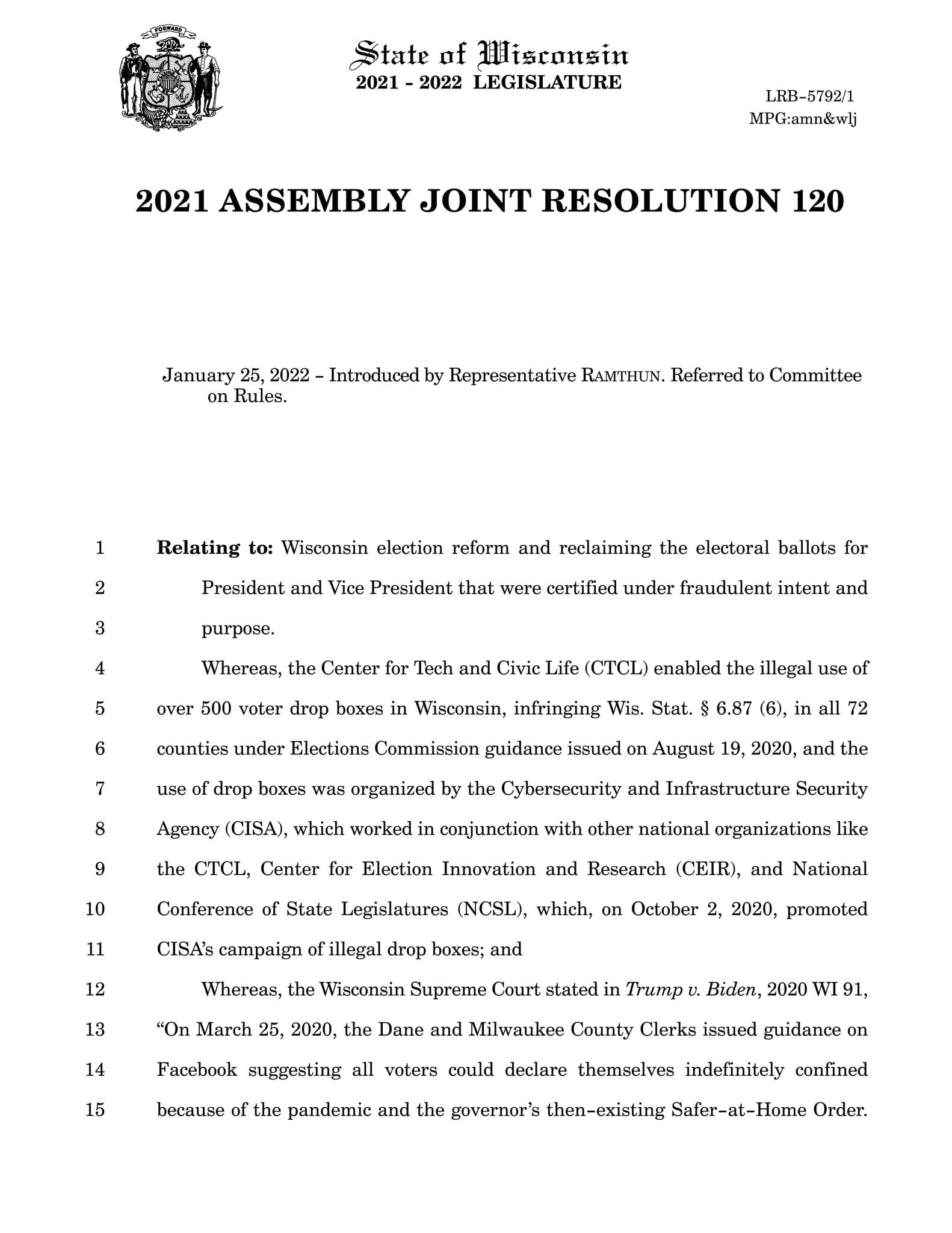 Wisconsin resolution on election reform and reclaiming electoral ballots for the 2020 presidential election that were certified under fraudulent intent and purpose unanimously passed the Wisconsin State Assembly floor, referred to committee where it failed.