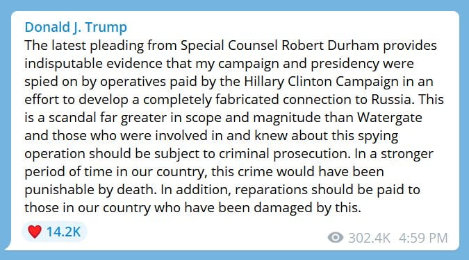 Trump statement on Durham indictment alleging the Clinton campaign paid for a tech company to spy on the Executive Office of the President of the United States.