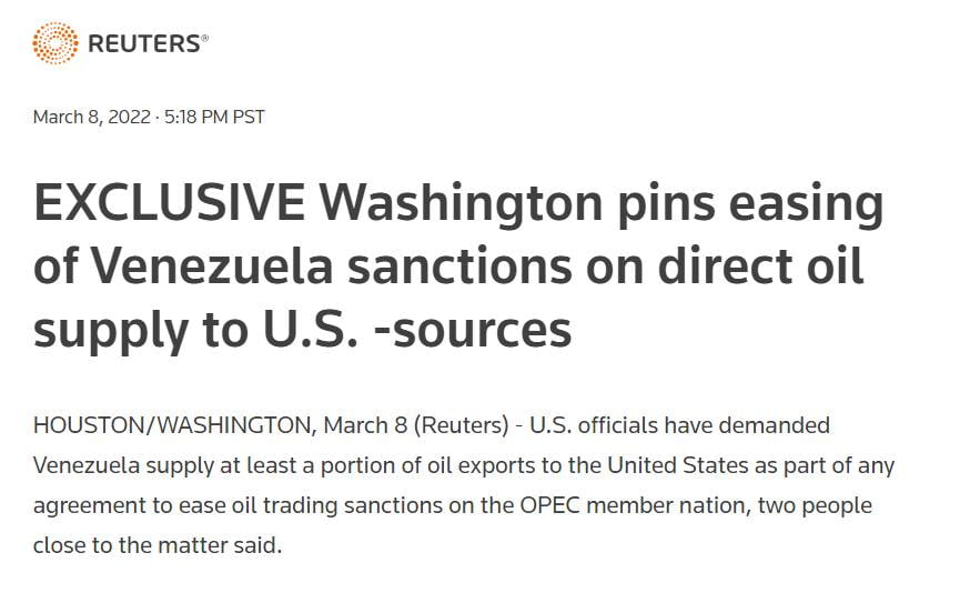 Categories via Facebook Biden is getting desperate, wants Venezuelan oil in exchange… Post author By W. Post date March 8, 2022 No Comments on Biden is getting desperate, wants Venezuelan oil in exchange… Biden is getting desperate, wants Venezuelan oil in exchange for lifting sanctions on Venezuelan oil. ^ ← Saudi Arabia and United Arab Emirates won’t pump more… → Poland offers its MiG-29 jets to US, didn’t consult… Leave a Reply Cancel replyYour email address will not be published. Required fields are marked *Comment * Name * Email * Website Save my name, email, and website in this browser for the next time I comment. Δ