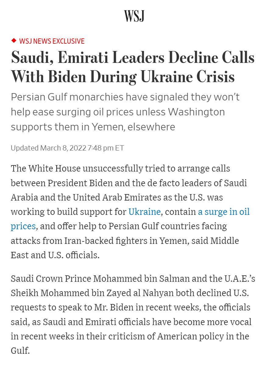 Saudi Arabia and United Arab Emirates won’t pump more oil for Biden, decline to answer his phone calls.