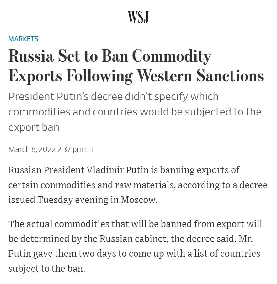 Categories via Facebook Russia set to ban commodity exports, details to follow Post author By W. Post date March 9, 2022 No Comments on Russia set to ban commodity exports, details to follow Russia set to ban commodity exports, details to follow. ^ ← Ukraine believes you’re not helping enough, bans wheat exports → Ukraine between the US sponsored 2014 Maidan Revolution and… Leave a Reply Cancel replyYour email address will not be published. Required fields are marked *Comment * Name * Email * Website Save my name, email, and website in this browser for the next time I comment. Δ
