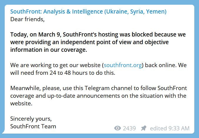 Categories via Facebook SouthFront, which wasn’t taken down over Iraq, Syria, Libya… Post author By W. Post date March 9, 2022 No Comments on SouthFront, which wasn’t taken down over Iraq, Syria, Libya… SouthFront, which wasn’t taken down over Iraq, Syria, Libya, Yemen, etc., was taken down over Ukraine. ^ ← Russian Ministry of Defense alleges Ukrainian National Guard was… → Hospitals are bombed in war. It happened in Syria… Leave a Reply Cancel replyYour email address will not be published. Required fields are marked *Comment * Name * Email * Website Save my name, email, and website in this browser for the next time I comment. Δ