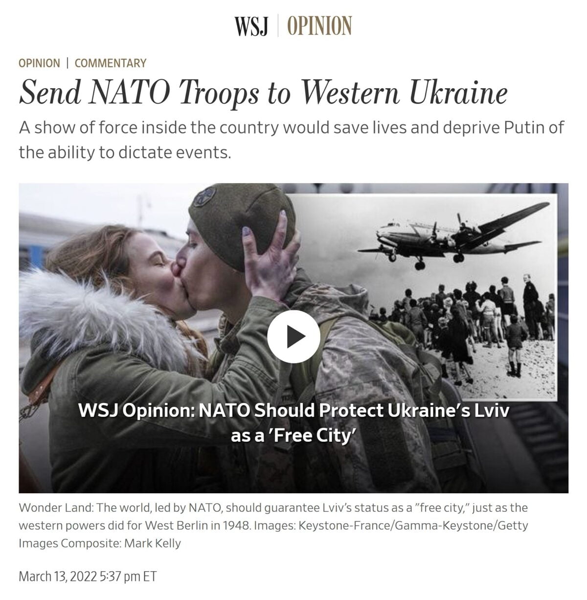 Categories via Facebook NATO troops in western Ukraine is a real consideration Post author By W. Post date March 13, 2022 No Comments on NATO troops in western Ukraine is a real consideration NATO troops in western Ukraine is a real consideration. ^ ← Biden should mandate gas prices lower, that always works → Russian President Vladimir Putin, ”On the Historical Unity of… Leave a Reply Cancel replyYour email address will not be published. Required fields are marked *Comment * Name * Email * Website Save my name, email, and website in this browser for the next time I comment. Δ