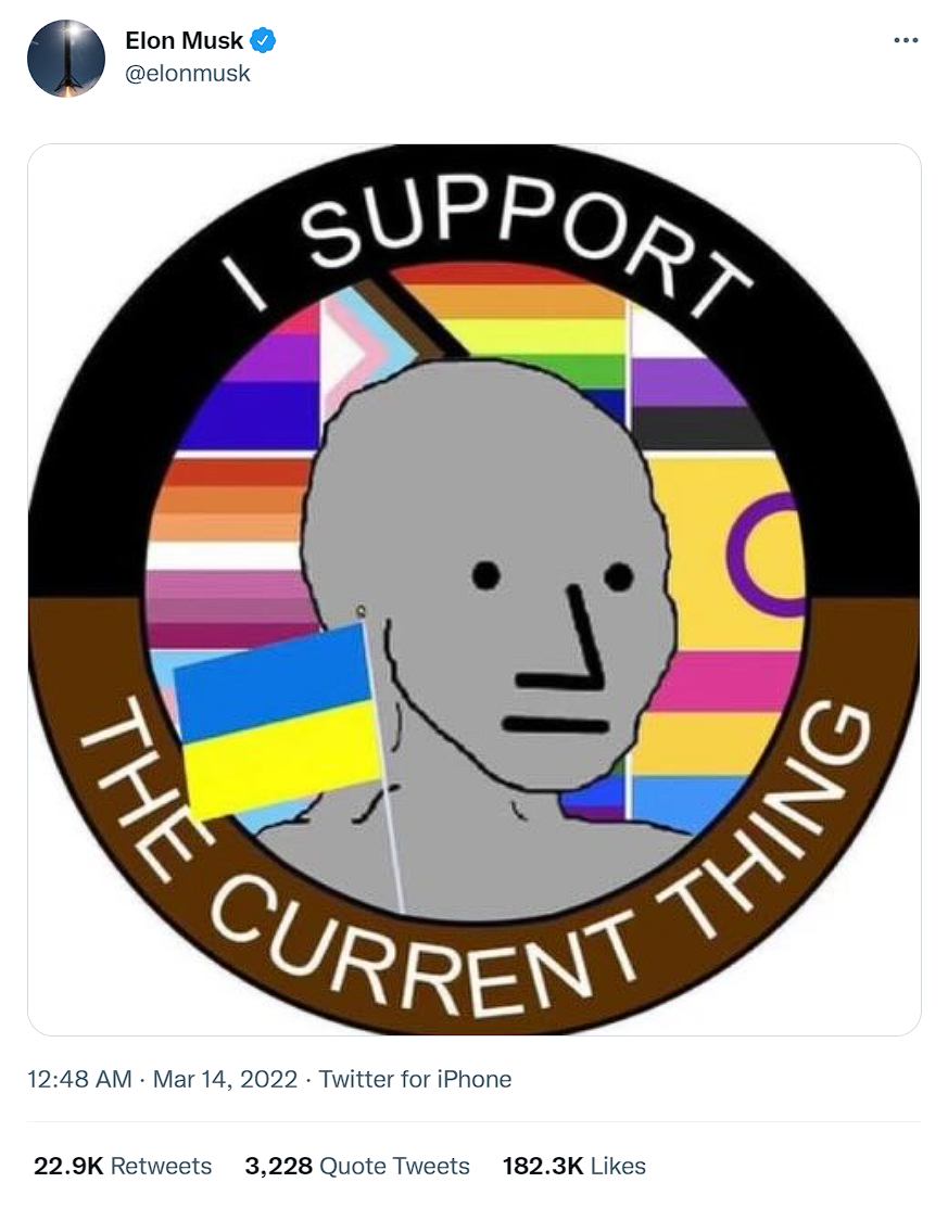 Categories via Facebook What is Elon Musk up to now? Post author By W. Post date March 14, 2022 No Comments on What is Elon Musk up to now? What is Elon Musk up to now? This is the problem with taking on the Tesla people, their leader is untouchable. ^ ← Everyone is laughing at Biden enlisting TikTok creators to… → They want hero Zelensky to start WW3, a small… Leave a Reply Cancel replyYour email address will not be published. Required fields are marked *Comment * Name * Email * Website Save my name, email, and website in this browser for the next time I comment. Δ