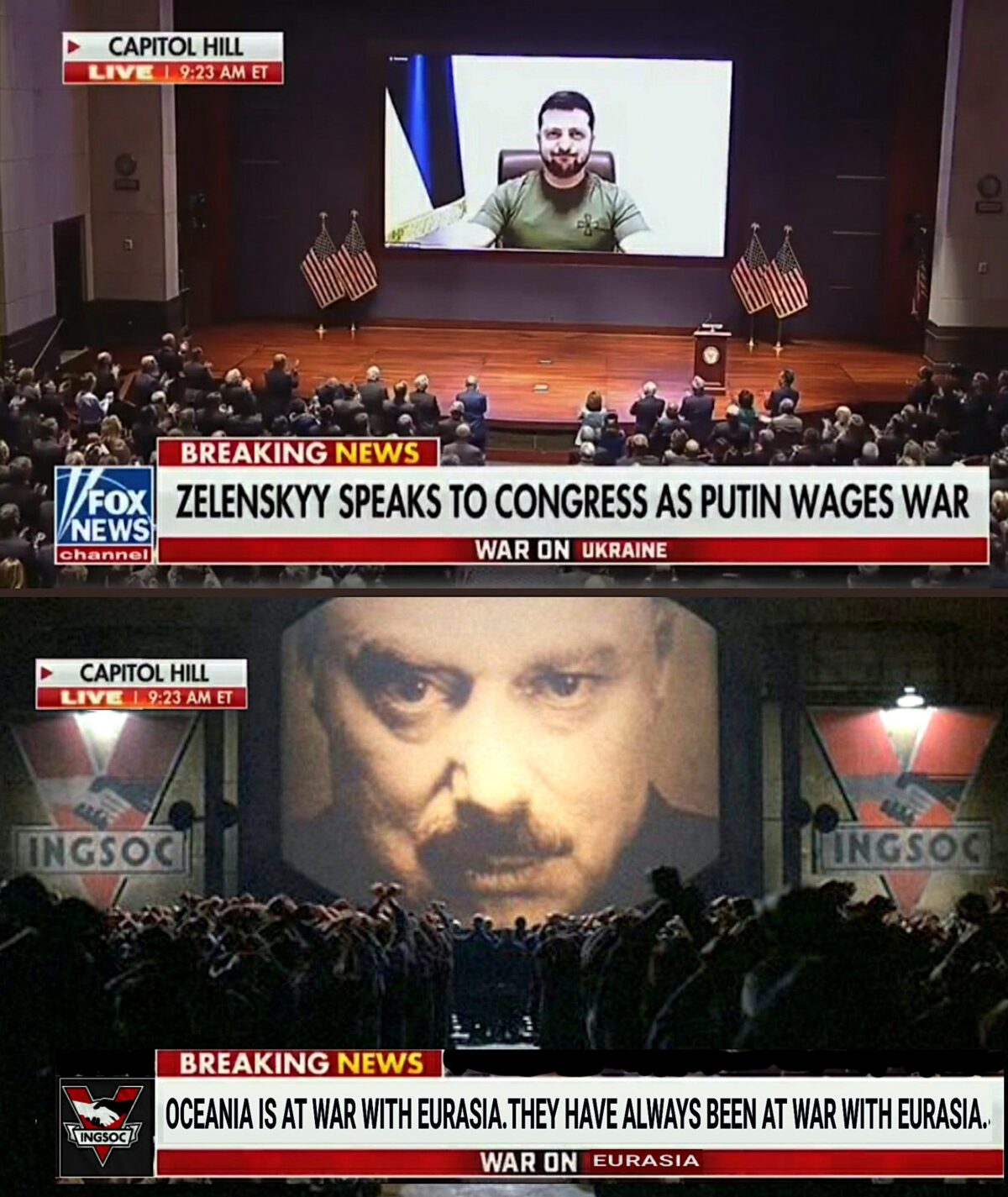 Categories via Facebook We’ve always been at war with Eurasia Post author By W. Post date March 18, 2022 No Comments on We’ve always been at war with Eurasia We’ve always been at war with Eurasia. ^ ← Russia captured Mariupol airport outside of Mariupol in Ukraine → Russia fired a nuclear-capable hypersonic air-to-ground Kh-47M2 Kinzhal missile… Leave a Reply Cancel replyYour email address will not be published. Required fields are marked *Comment * Name * Email * Website Save my name, email, and website in this browser for the next time I comment. Δ