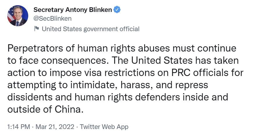 Biden Secretary of State Blinken announces sanctions via visa restrictions on PRC officials. This ought to be good. At the rate they’re going with China, they’ll be accusing the Chinese of developing coronavirus bioweapons in Wuhan in no time.