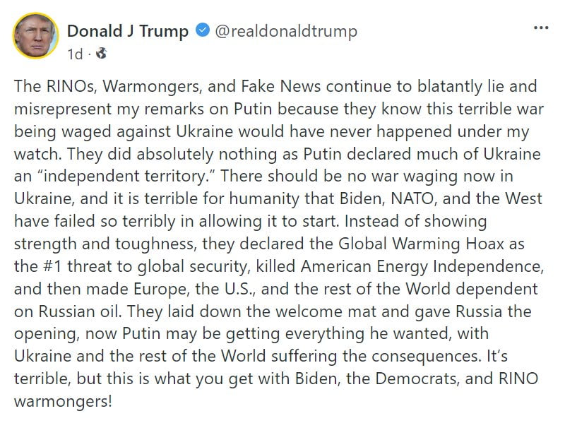 Trump statement on Biden, Democrats, and RINO warmongers.