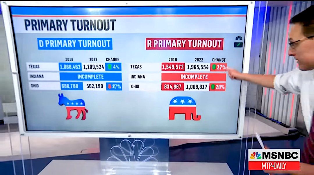 Primary turnout in Texas and Ohio, 2022 vs. 2018. Republicans are +27% and +28%, Democrats are +4% and -27%.