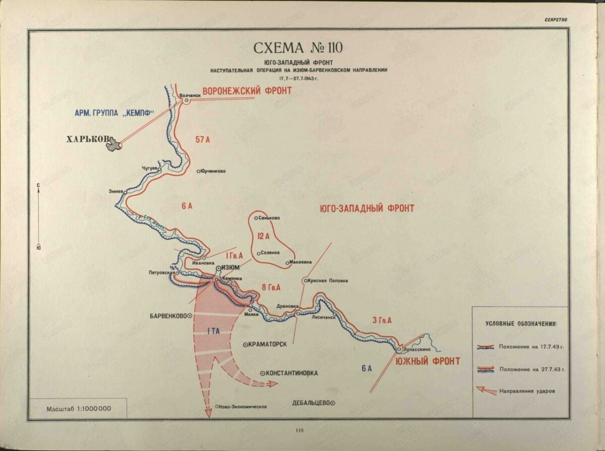 An old map of Soviet Russian communist forces pushing back Hitler’s German Nazi forces near Kramatorsk in eastern Ukraine in 1943, also where the frontline in eastern Ukraine is right now.