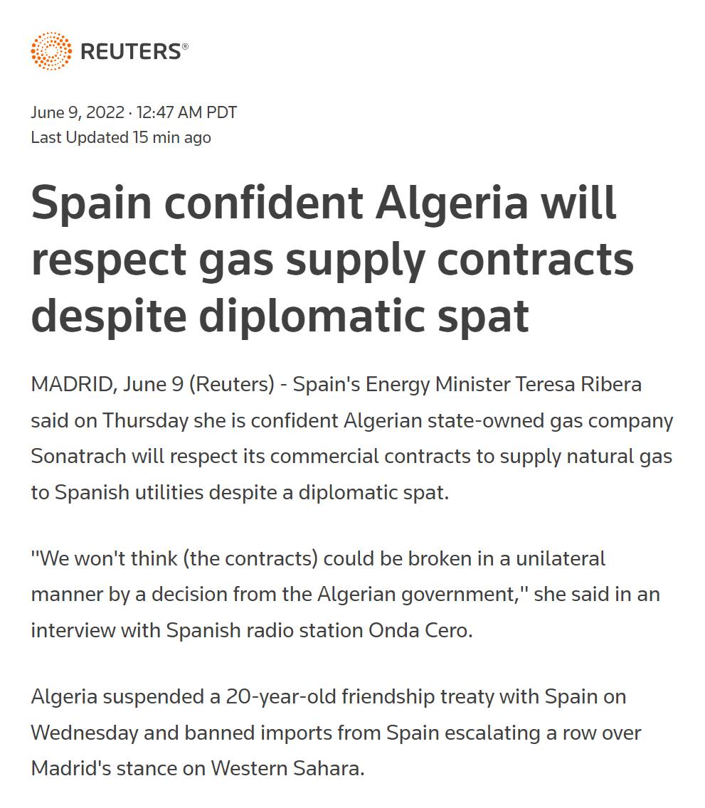 Categories via Facebook Spain is confident Algeria won’t cut off natural gas… Post author By W. Post date June 9, 2022 No Comments on Spain is confident Algeria won’t cut off natural gas… Spain is confident Algeria won’t cut off natural gas exports. We won’t think is right. ^ ← Algeria, a major exporter of natural gas to Europe… → TAPI executive director in a meeting between the Herat… Leave a Reply Cancel replyYour email address will not be published. Required fields are marked *Comment * Name * Email * Website Save my name, email, and website in this browser for the next time I comment. Δ