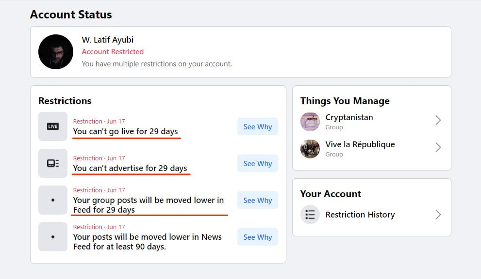 Zuckerberg just gave me three more restrictions for a comment where I congratulated the NRF for capturing a Taliban helicopter and suggested that the Taliban should learn to be more careful with their equipment.
