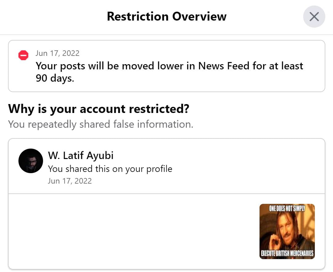 Zuckerberg again reset my 90-day restriction to a starting date of June 17th, this time because I shared in a comment on my own post a meme that I created of Sean Bean from Lord of the Rings saying, “one does not simply execute British mercenaries”.