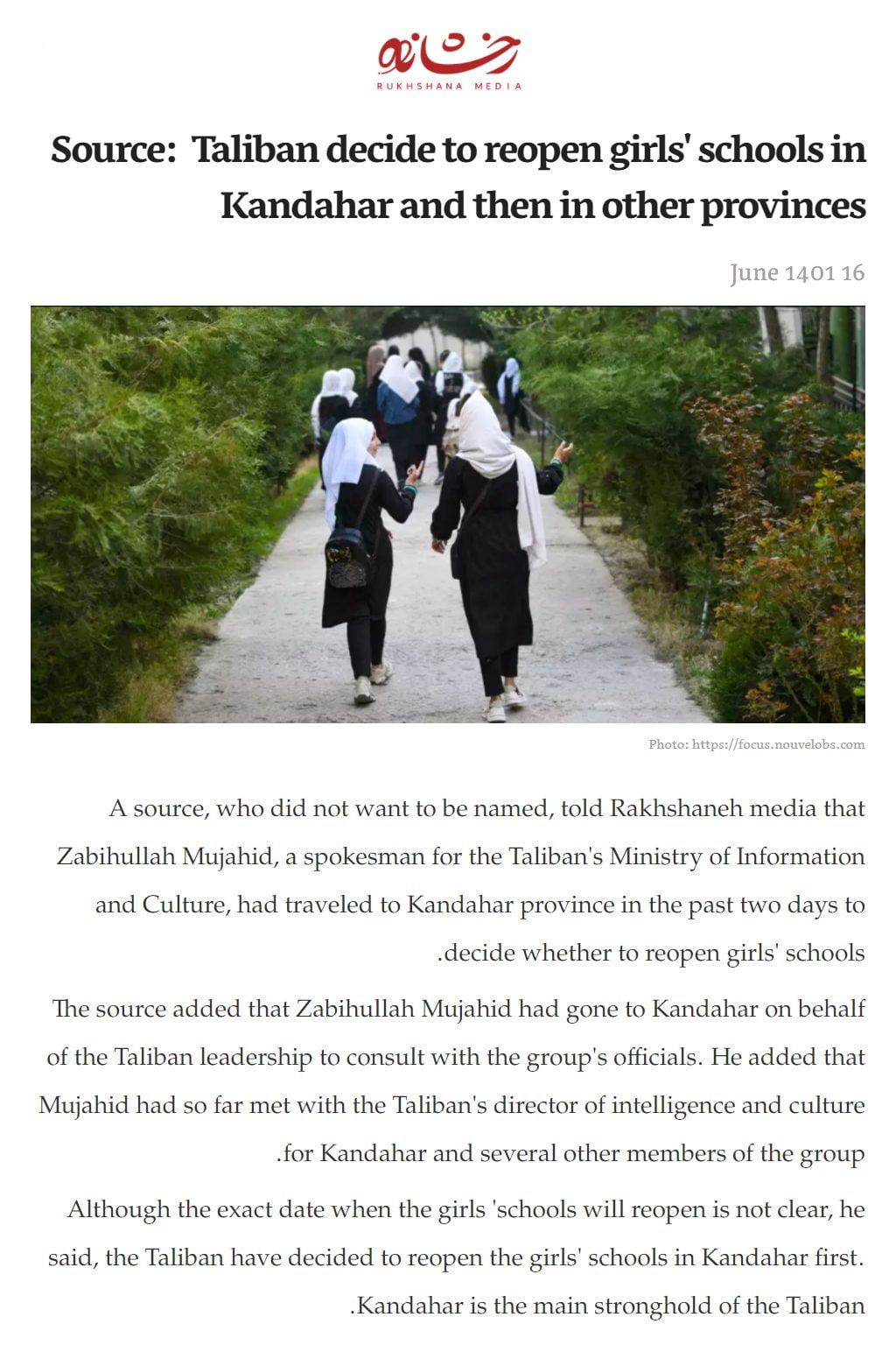 Rukhshana Media reports a source told them that IEA has decided to open girls’ secondary public schools, first in Kandahar, then in the rest of Afghanistan.