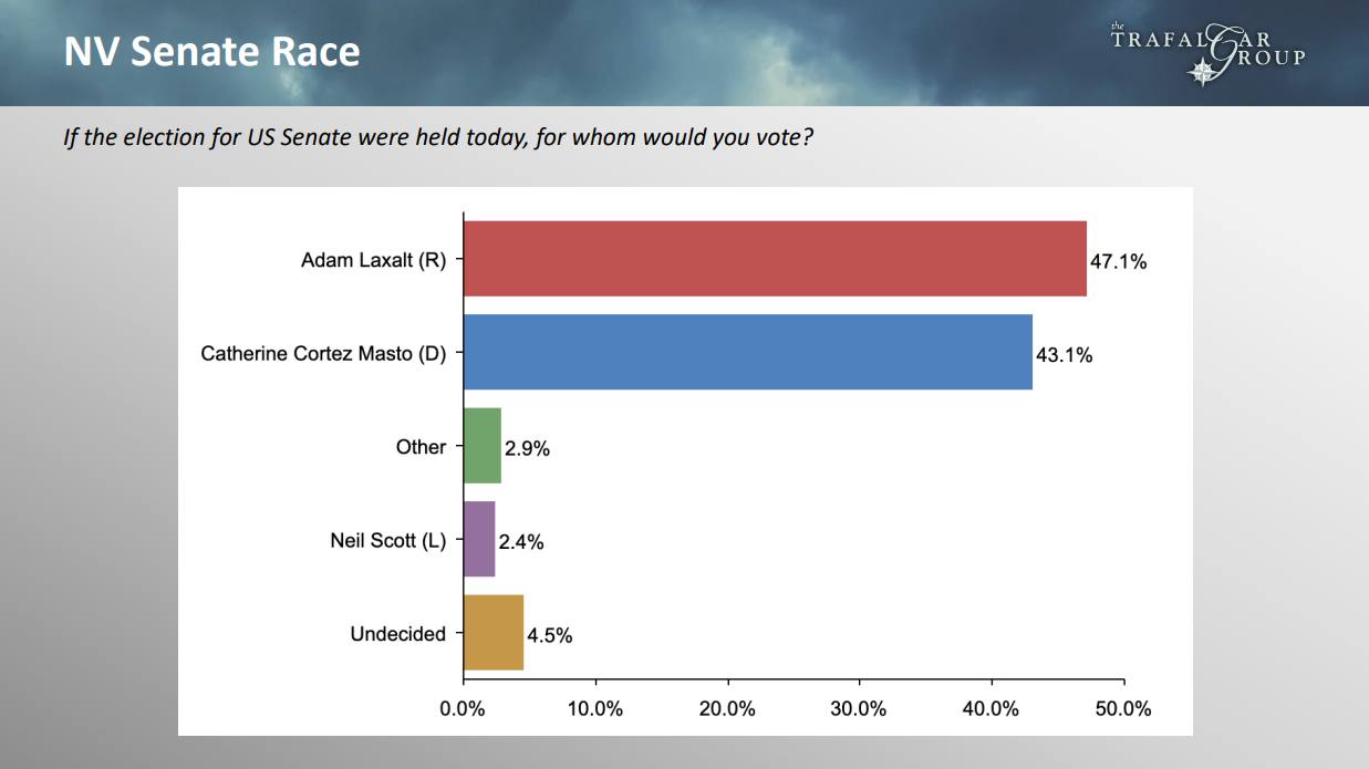 Categories via Facebook Trafalgar for Nevada, 9/22. Laxalt (R) 47, Cortez-Masto (D)… Post author By W. Post date September 22, 2022 No Comments on Trafalgar for Nevada, 9/22. Laxalt (R) 47, Cortez-Masto (D)… Trafalgar for Nevada, 9/22. Laxalt (R) 47, Cortez-Masto (D) 43. Laxalt +4. Laxalt is up one point over the past month. ^ ← Russian announced partial mobilization against Ukraine now underway → InsiderAdvantage for Nevada, 9/22. Laxalt (R) 46, Cortez-Masto (D)… Leave a Reply Cancel replyYour email address will not be published. Required fields are marked *Comment * Name * Email * Website Save my name, email, and website in this browser for the next time I comment. Δ