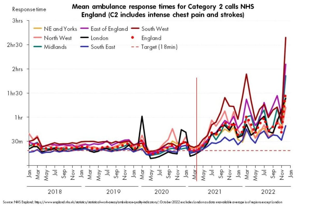 Ambulance response times for chest pain and stroke calls, NHS England.
