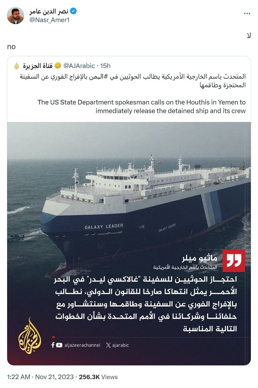 Yemeni Houthi response to US State Department request for Israeli Galaxy Leader ship and crew to be released.