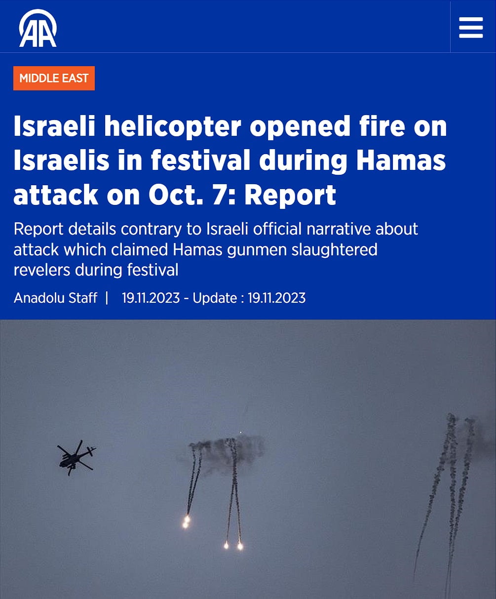Anadolu: Israeli helicopter opened fire on Israelis in festival during Hamas attack on Oct. 7.