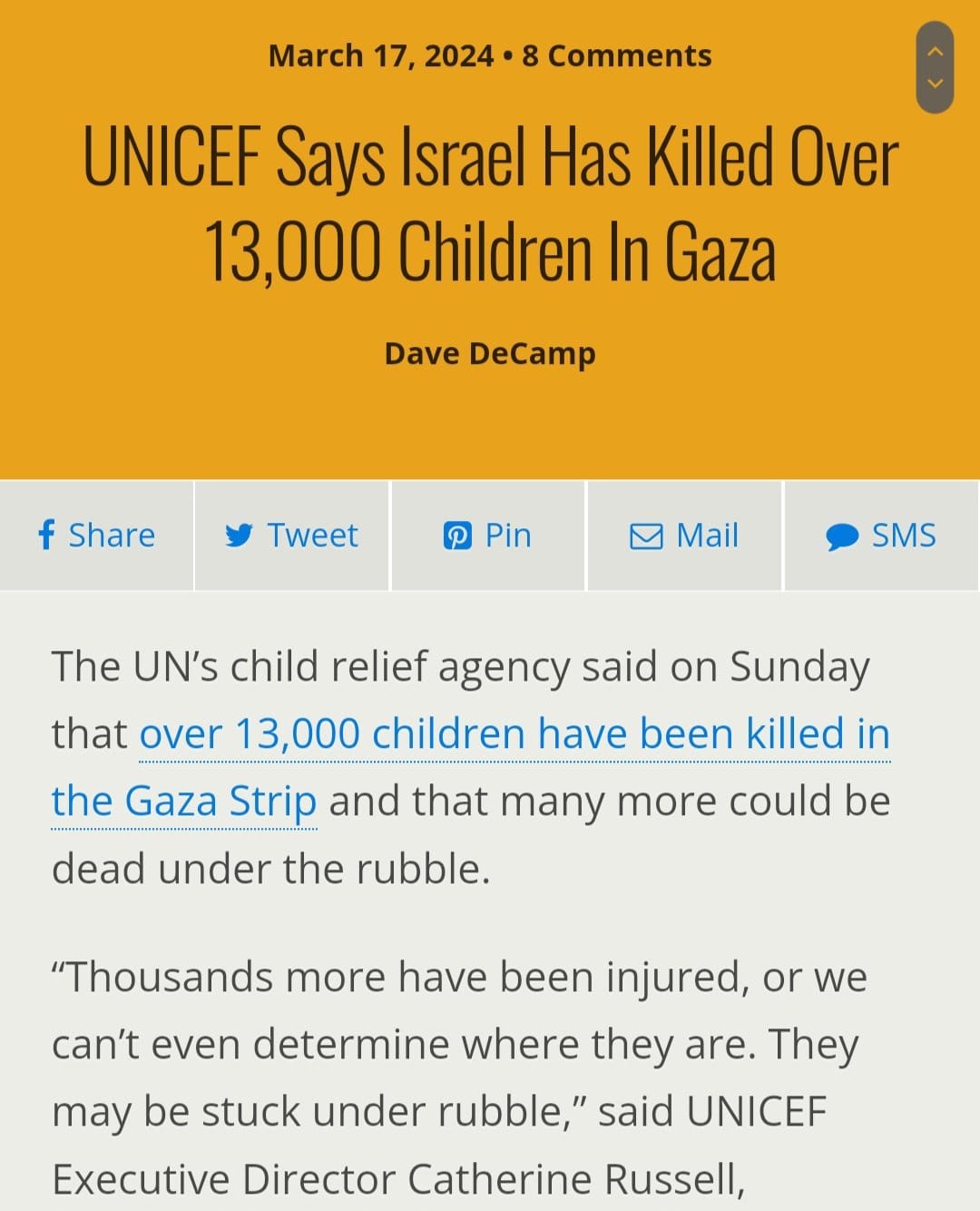 Categories via Facebook UNICEF says Israel killed 13,000 children Post author By W. Post date March 18, 2024 No Comments on UNICEF says Israel killed 13,000 children UNICEF says Israel killed 13,000 children. ^ ← Biden wants to oust Netanyahu to save himself and… → Niger orders American troops to leave its territory after… Leave a Reply Cancel replyYour email address will not be published. Required fields are marked *Comment * Name * Email * Website Save my name, email, and website in this browser for the next time I comment. Δ