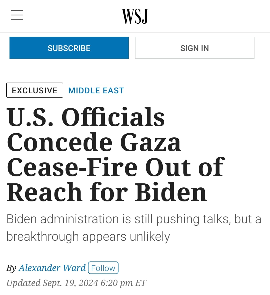 Categories via Facebook Joe Biden failed to end the Israeli war on… Post author By W. Post date September 21, 2024 No Comments on Joe Biden failed to end the Israeli war on… Joe Biden failed to end the Israeli war on Gaza, officially surrendering to Benjamin Netanyahu. ^ ← Israel detonates thousands of pagers across Lebanon, injuring thousands → US expects significant escalation between Israel and Hezbollah in… Leave a Reply Cancel replyYour email address will not be published. Required fields are marked *Comment * Name * Email * Website Save my name, email, and website in this browser for the next time I comment. Δ