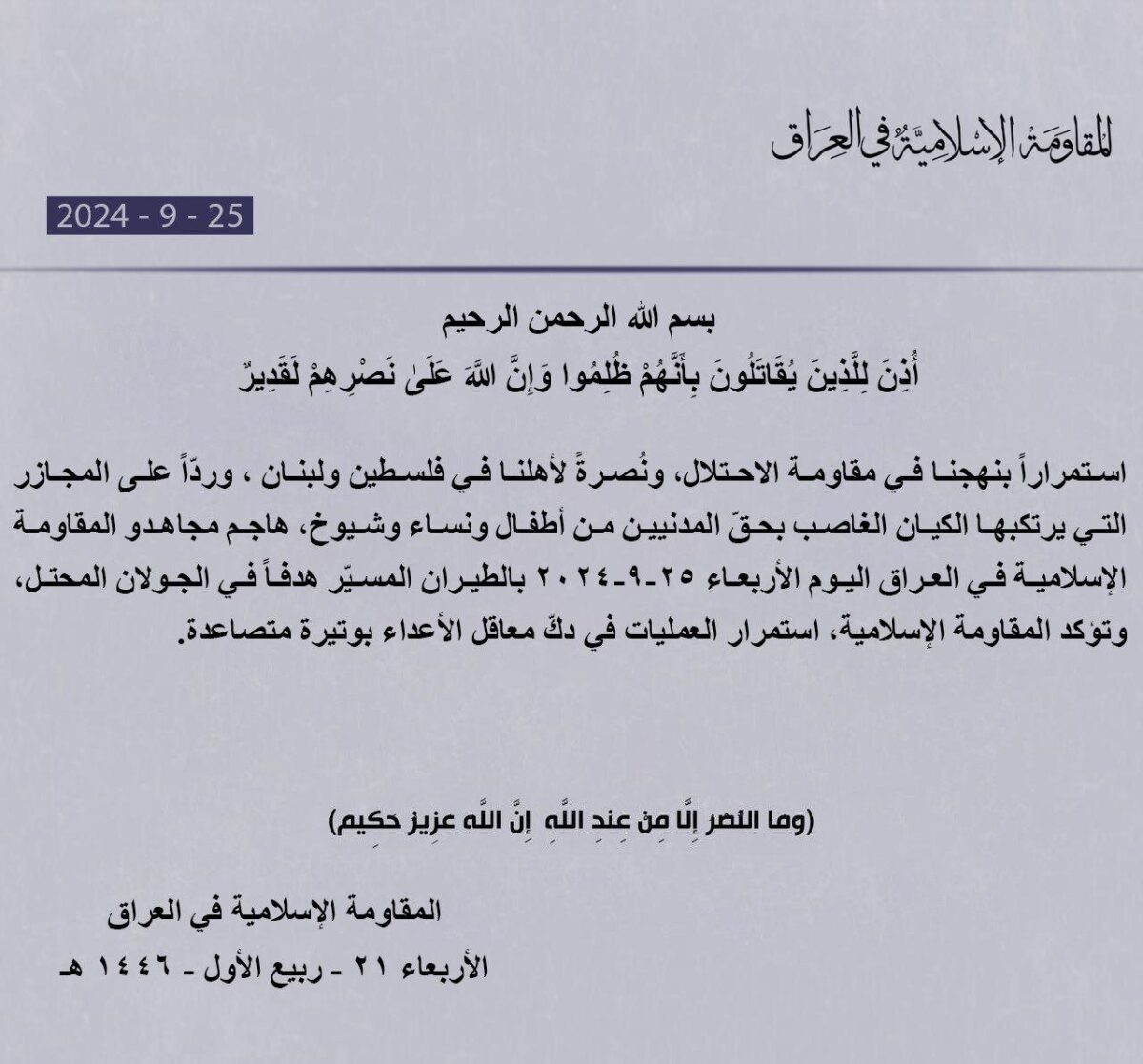 In continuation of our approach to resisting the occupation, and in support of our people in Palestine and Lebanon, and in response to the massacres committed by the usurping entity against civilians, including children, women and the elderly, the Mujahideen of the Islamic Resistance in Iraq attacked today, Wednesday 9-25-2024, with drones, a target in the occupied Golan Heights. The Islamic Resistance confirms the continuation of operations to destroy the strongholds of the enemies at an escalating pace.