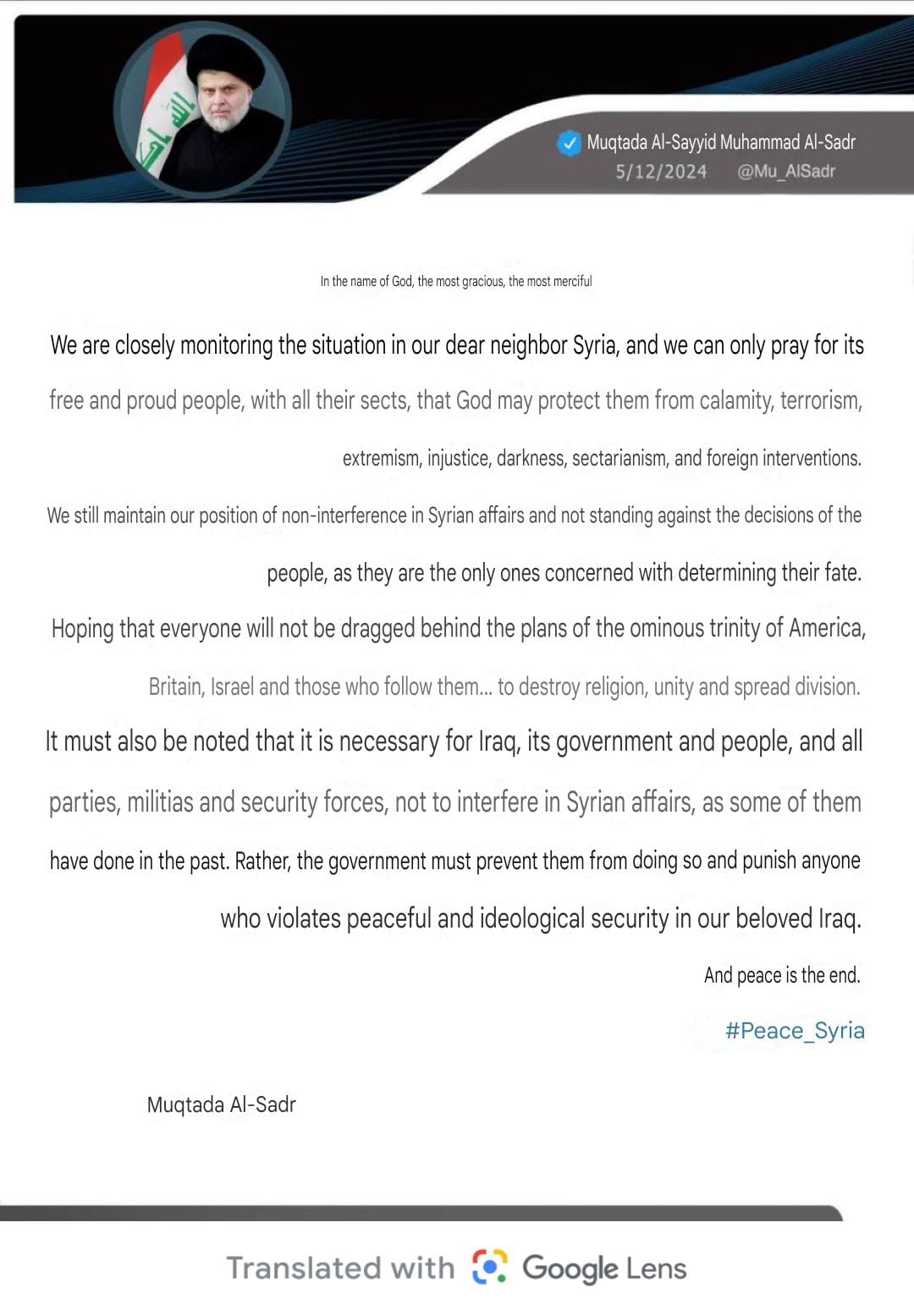 Categories via Facebook Muqtada al-Sadr says Iraqis should not get involved in… Post author By W. Post date December 5, 2024 No Comments on Muqtada al-Sadr says Iraqis should not get involved in… Muqtada al-Sadr says Iraqis should not get involved in Syria as they did last time. ^ ← Syrians fleeing from Homs towards Tartus in anticipation of… → Russian strike on the bridge between Hama and Homs… Leave a Reply Cancel replyYour email address will not be published. Required fields are marked *Comment * Name * Email * Website Save my name, email, and website in this browser for the next time I comment. Δ