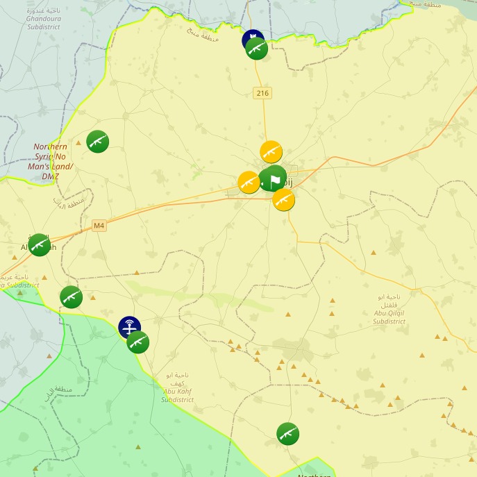 Turkish-backed SNA with Turkish armed forces artillery and UAV support advancing on SDF-held Manbij, Syria.