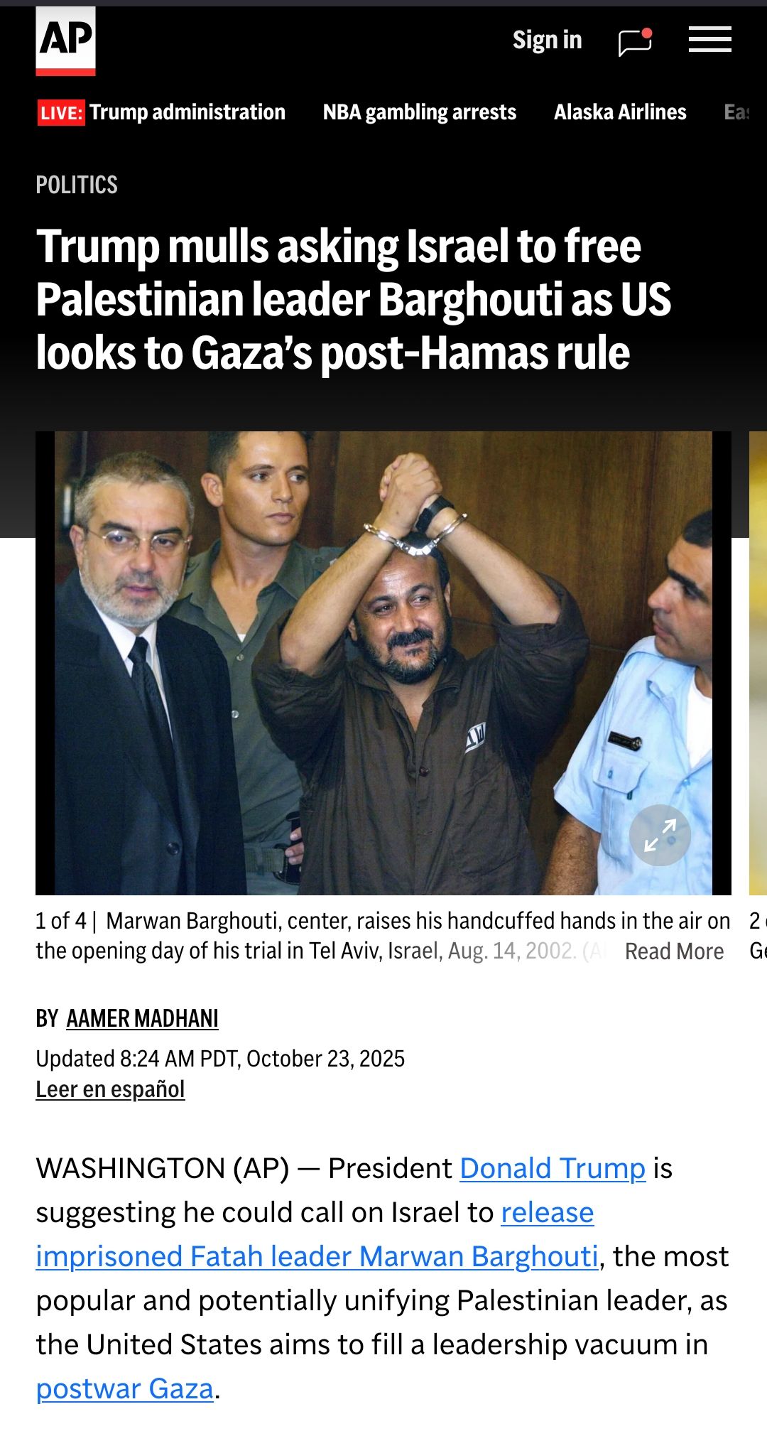 Trump mulls asking Israel to free Palestinian leader Barghouti as US looks to Gaza’s post-Hamas rule.