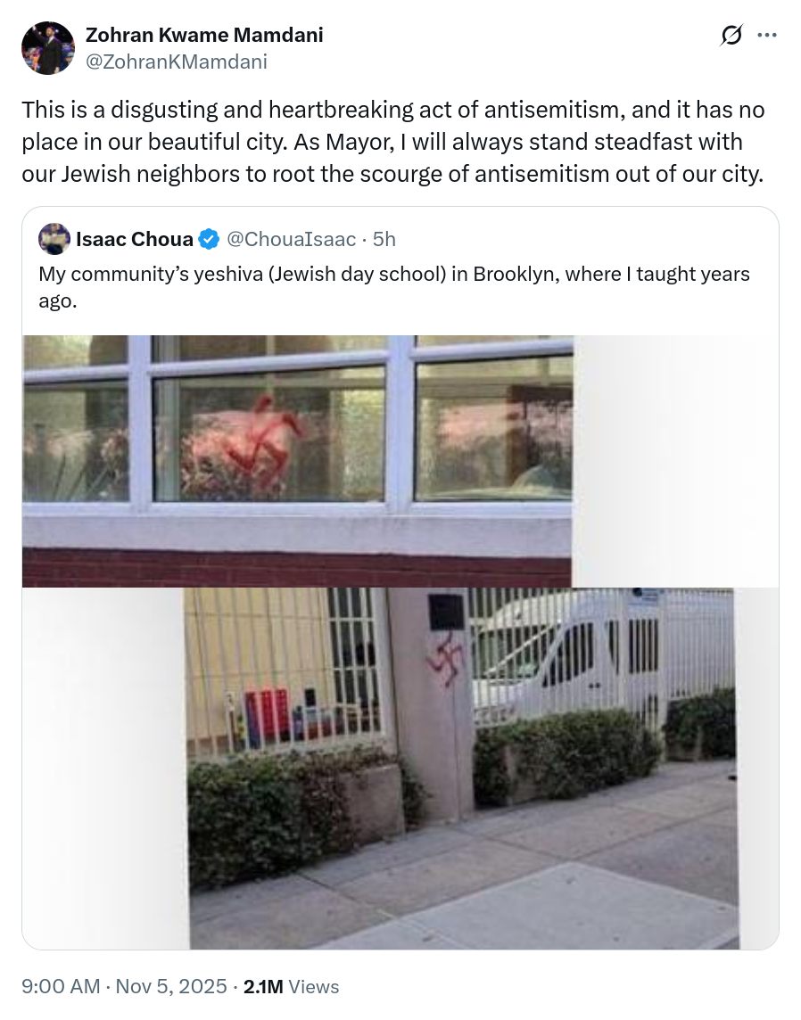 Mamdani’s first real tweet (the second tweet) the morning after his victory is to stand with the Jews against the antisemites.