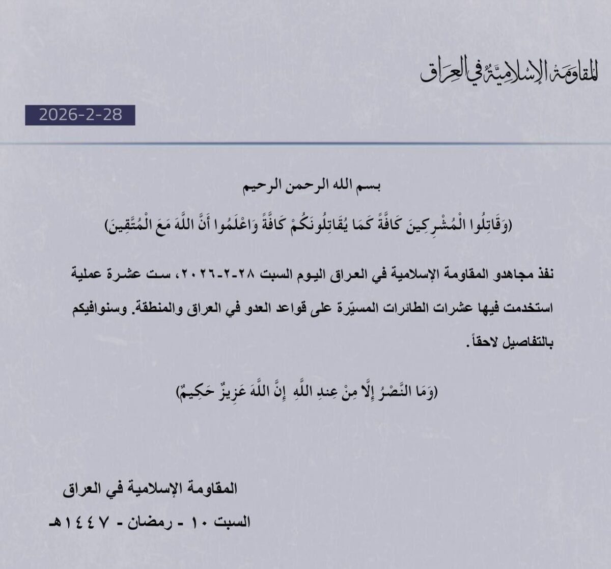 Categories via Facebook Islamic Resistance in Iraq carried out 16 operations Post author By W. Post date February 28, 2026 No Comments on Islamic Resistance in Iraq carried out 16 operations Islamic Resistance in Iraq carried out 16 operations. ^ ← Iranian missile impacts in Tel Aviv, Israel → Iranian ballistic missile strike on Tel Aviv, Israel Leave a Reply Cancel replyYour email address will not be published. Required fields are marked *Comment * Name * Email * Website Save my name, email, and website in this browser for the next time I comment. Δ