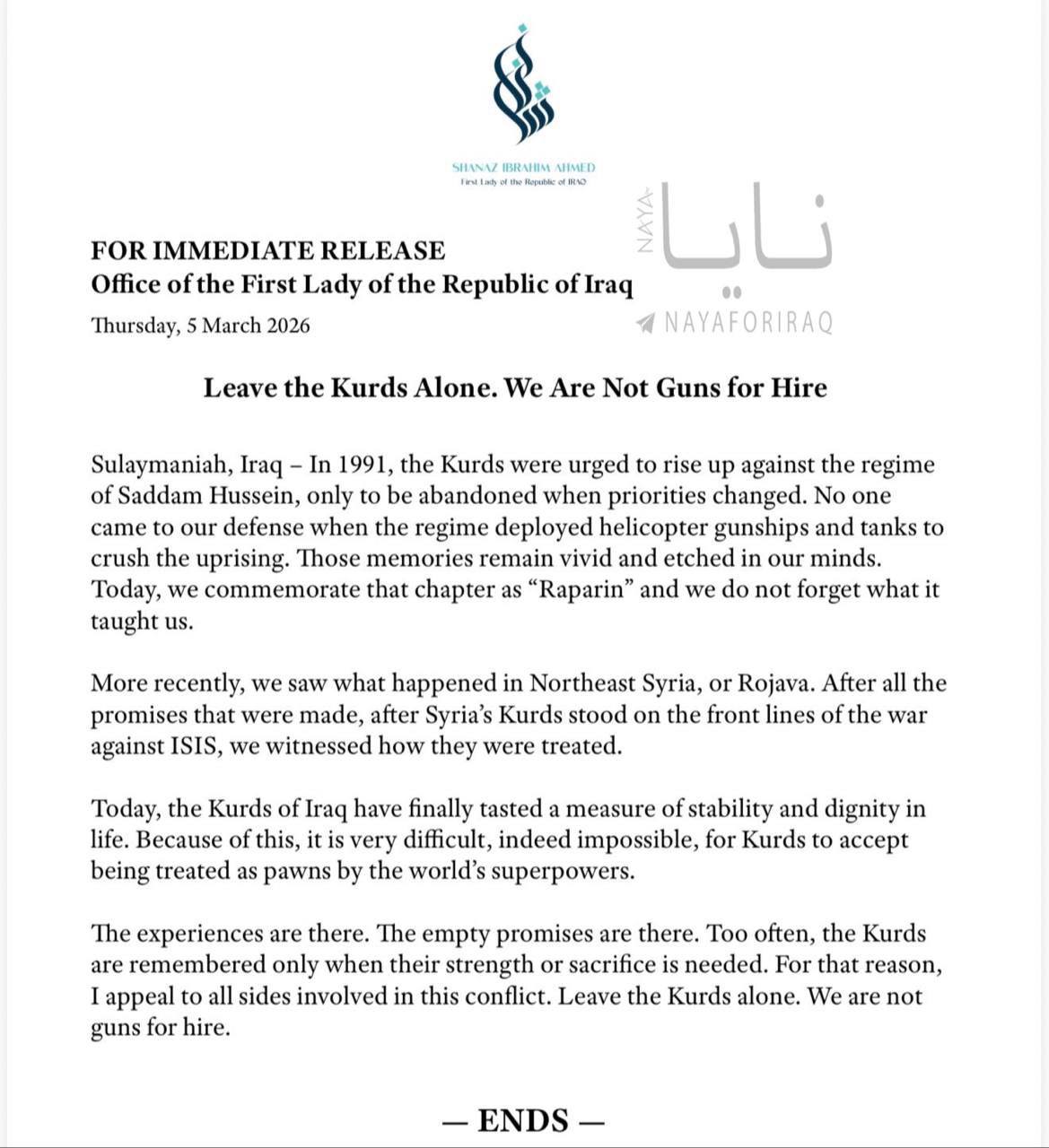 Categories via Facebook First Lady of Iraq and a leader in the… Post author By W. Post date March 5, 2026 No Comments on First Lady of Iraq and a leader in the… First Lady of Iraq and a leader in the Patriotic Union of Kurdistan party. ^ ← They’re not false flags. Drone strike on Azerbaijan was… → Kurds are slow learners, some of the slowest, but… Leave a Reply Cancel replyYour email address will not be published. Required fields are marked *Comment * Name * Email * Website Save my name, email, and website in this browser for the next time I comment. Δ